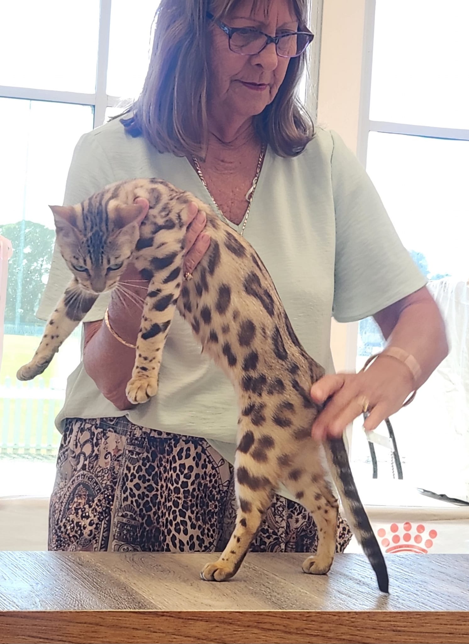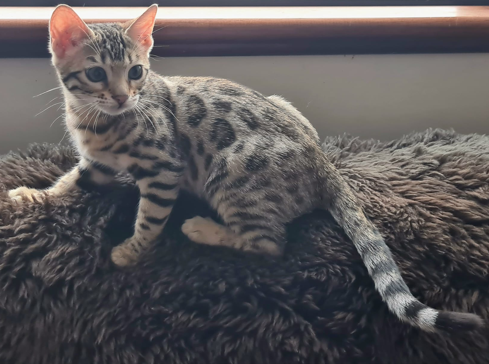 Our lovely brown girl with high contrasted rosette patterning with no bars. This girls pattern is just beautiful and she has a nice head shape, whisker pads, chin, rounded ears and pattern flow. We're looking forward to her addition into the program for breeding in 2024. HCM NORMAL test 26-Mar-2024 @ age 1yr 7mo.